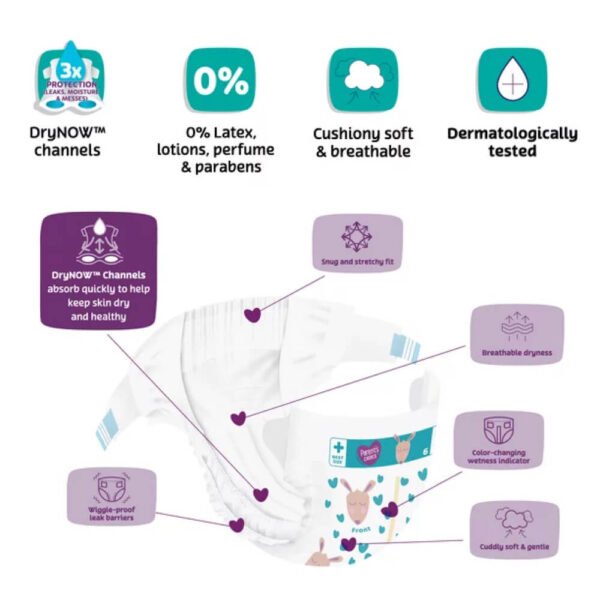 Parent’s Choice Dry and Gentle Diapers help keep your baby comfortable and happy. The diapers’ wetness indicators will change colors, letting you know when it’s time to change your baby’s diaper. The DryNOW channels absorb quickly to help keep skin dry and healthy. These diapers also have a snug and stretchy fit with wiggle-proof leak barriers. Each diaper is made without natural latex, lotions, and perfumes so you can trust they will be gentle on your baby’s skin. Choose from two stylish, fun prints in multiple sizes and bring home our Parent’s Choice Dry and Gentle Diapers today.At Parent’s Choice, our mission is simple: we’re committed to delivering quality diapers to help keep little ones dry, comfortable, and happy. Our diapers are dermatologically tested and made without latex, fragrance, and lotions to help maintain baby’s naturally healthy skin throughout the day or night.
